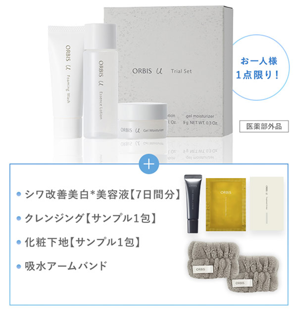 オルビスユーには化粧水・保湿液・洗顔料を7日間試せるトライアルが用意されています。非売品の吸水アームバンドとシワ改善美白※美容液、さらに高機能化粧下地とクレンジングオイルパウチまでセットになって送料無料で980円と超オトクです!